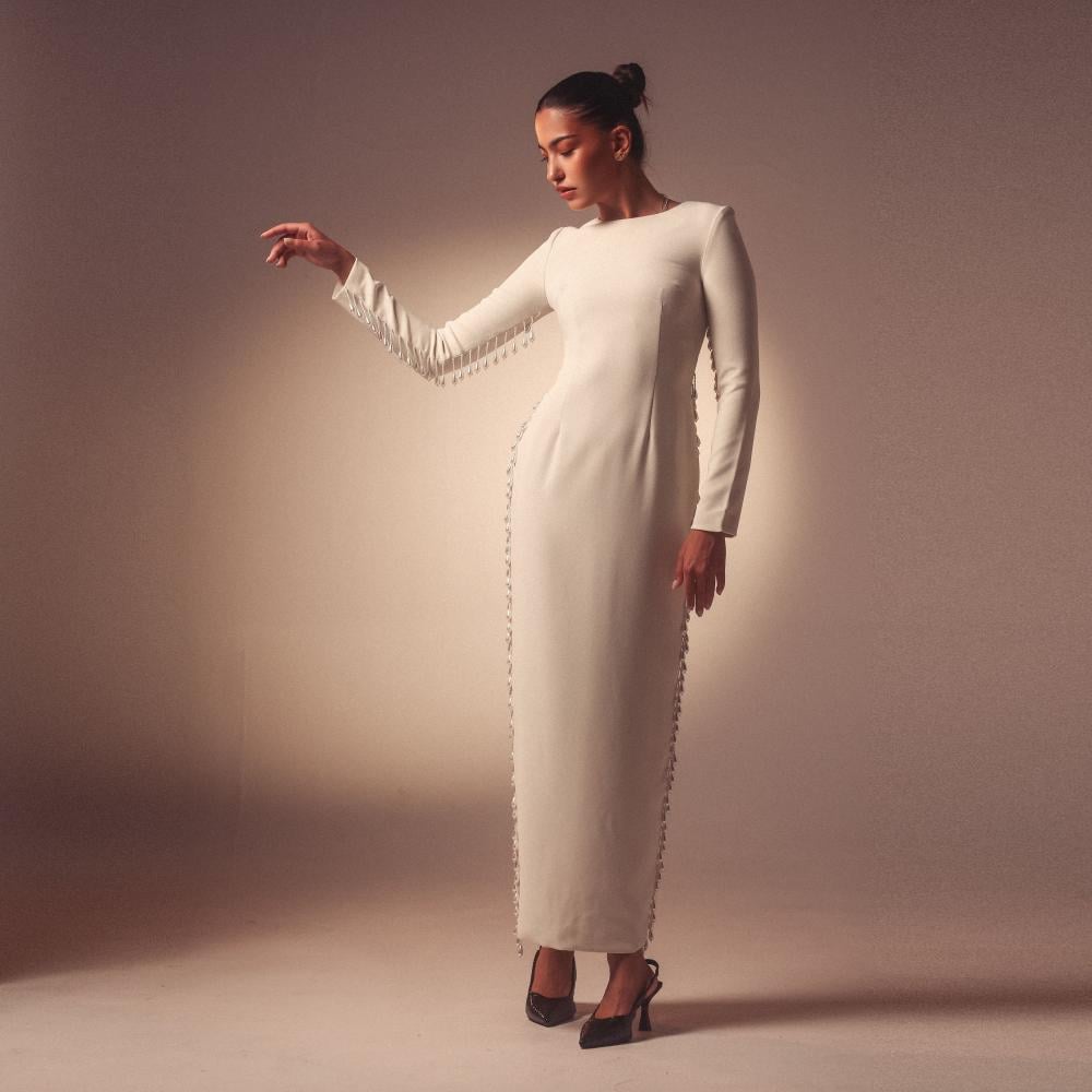 Description: An off white gown accented with cascading pearl drops along the sleeves and sides